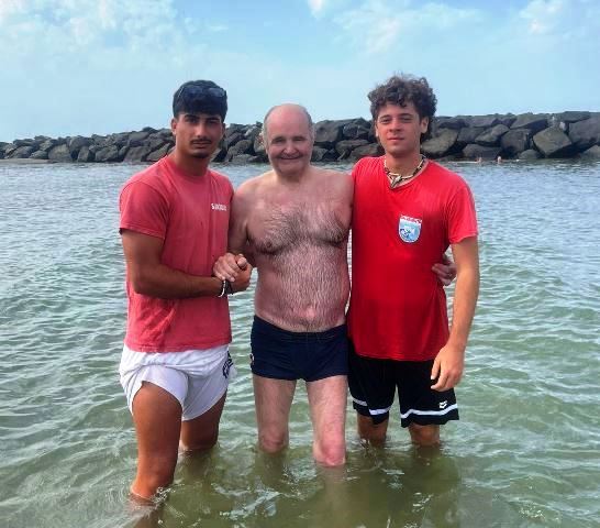 E proprio i due assistenti bagnanti hanno fatto il primo intervento di salvataggio, si tratta di Federico Pomenti e Alfredo Simonetti che hanno recuperato con pattino e a nuoto il signore (tra loro due nella foto) che si è trovato in difficoltà una volta uscito dal varco aperto nella scogliera. Bravi ragazzi!”