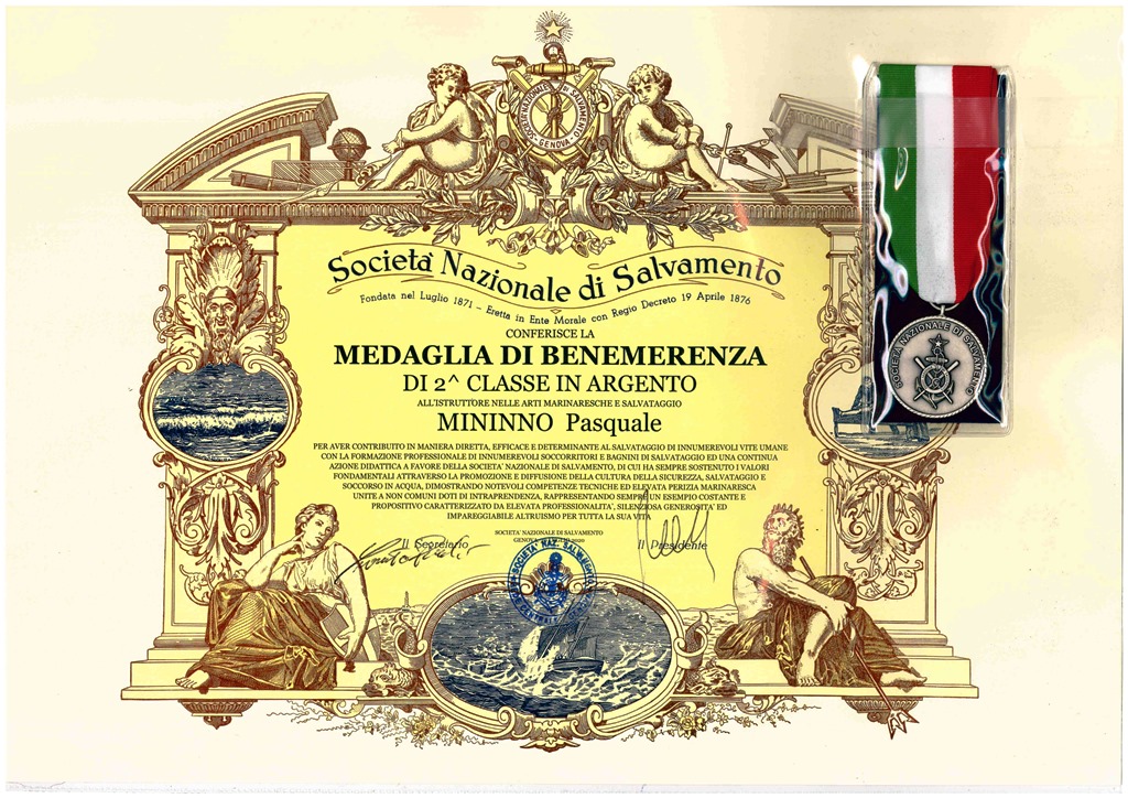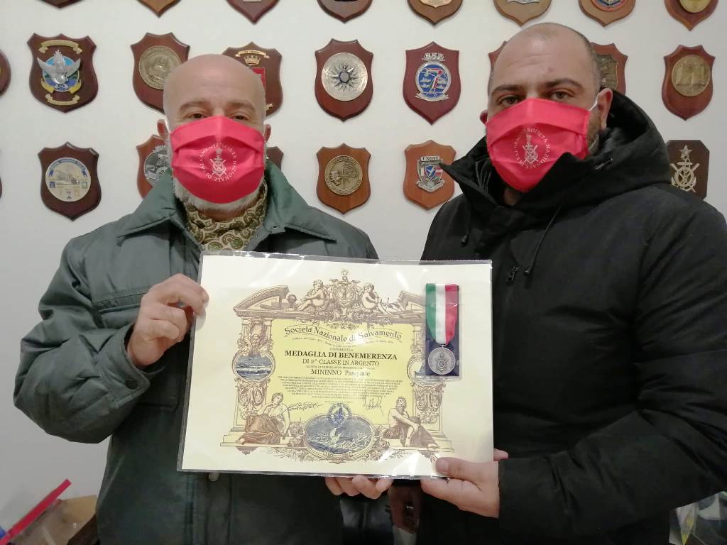 San Severo, Gennaio 2021 – La Società Nazionale di Salvamento ha conferito la “Medaglia di Benemerenza di 2^ Classe in Argento”, all’ Istruttore nelle Arti Marinaresche e Salvataggio Pasquale Mininno. Visto il protrarsi della pandemia “Covid-19”, tenuto conto delle restrizioni, il Presidente della Società Nazionale di Salvamento Genova, prof. Giuseppe Marino, ha delegato il Consigliere Nazionale e Direttore della ocale Sezione di San Severo (FG), sig. Alberto Tricarico, a consegnare la benemerenza. “Per aver contribuito in maniera diretta, efficace e determinante al salvataggio di vite umane con la formazione professionale di Soccorritori e Bagnini di salvataggio, da oltre un ventennio (20anni) sostenendo e promuovendo i valori fondamentali della Società Nazionale di Salvamento della Sicurezza e Salvataggio e Soccorso in Acqua, dimostrando notevole competenze tecniche ed elevata perizia marinaresca, unite a non comuni doti di intraprendenza, rappresentando sempre un esempio costante e propositivo caratterizzato da elevata professionalità, silenziosa generosità ed impareggiabile altruismo”.