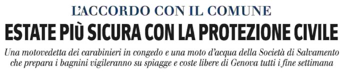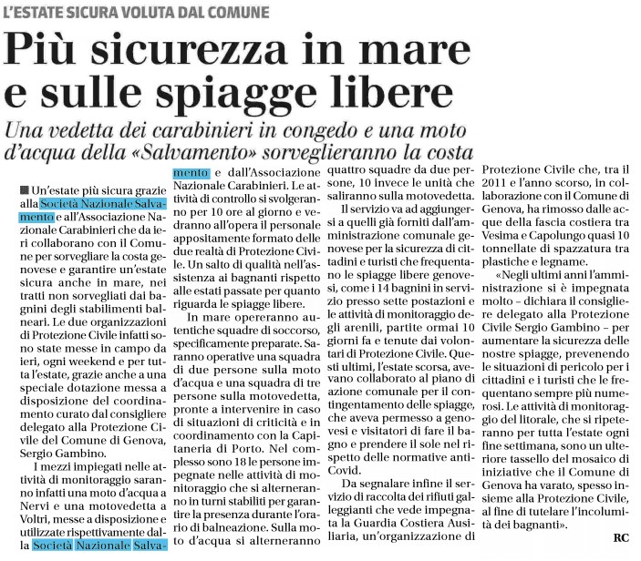 Genova, 27 Giugno 2021 – Riportiamo l’articolo pubblicato il 27/06/2021 sul quotidiano “Il Giornale” ed. del Piemonte e della Liguria. Dal 26 Giugno una motovedetta dei carabinieri in congedo e una moto d’acqua della Società Nazionale di Salvamento su spiagge e coste libere di Genova tutti i fine settimana: la collaborazione con il Comune di Genova.
