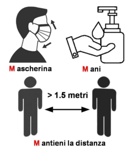 M come “mantieni le distanze”. Le Istituzioni raccomandano una distanza fisica di almeno 1,5 metri. Questo però non deve essere un limite stupidamente ricercato e ostentato in caso di contestazione. Non si tratta, con una metafora calcistica, di una verifica al VAR, ma della salute, nostra e di tutti. Ricordiamo che la maggior parte delle droplets cadono entro 2 metri, ma che la trasmissione aerogena del Coronavirus può superare anche i 5 metri.