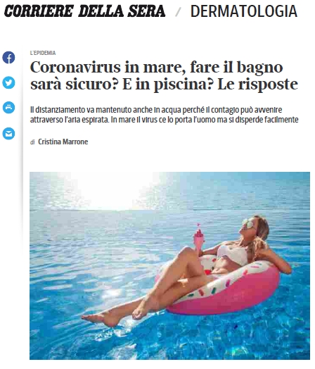 - E’ di primaria importanza mantenere le distanze interpersonali suggerite dalla conoscenza medica. Non solo lungo le vie d’accesso agli stabilimenti o alle spiagge libere, non solo nella collocazione in spiaggia, ma anche in acqua. Ricordiamo che in acqua la trasmissione virale da un individuo portatore a uno sano non avviene attraverso l’acqua stessa, ma attraverso l’aria espirata qualora due nuotatori si trovassero troppo vicini.