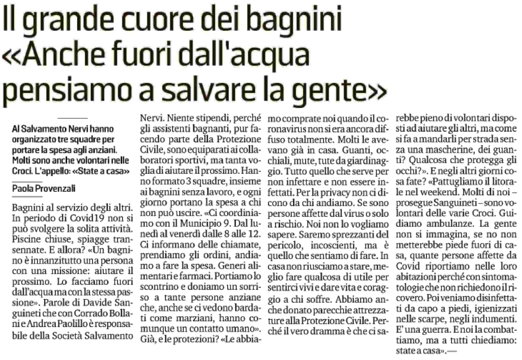 Genova, 24 Marzo 2020 – La “Salvamento” non si ferma. Riportiamo l’articolo di Paola Provenzali pubblicato sul quotidiano “Il Secolo XIX” il 23/03/2020. Tre squadre della Società Nazionale di Salvamento di Genova Nervi in azione.