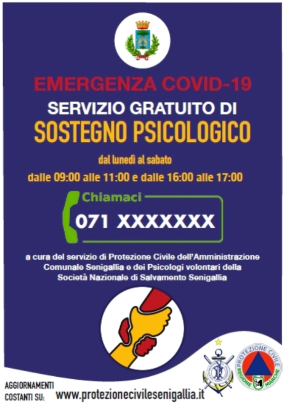 Senigallia, 24 Marzo 2020 – Contro il Coronovirus una bella iniziativa del Servizio Protezione Civile del Comune di Senigallia in collaborazione con la locale Sezione della Società Nazionale di Salvamento: al servizio della popolazione un pool di Psicologi volontari.
