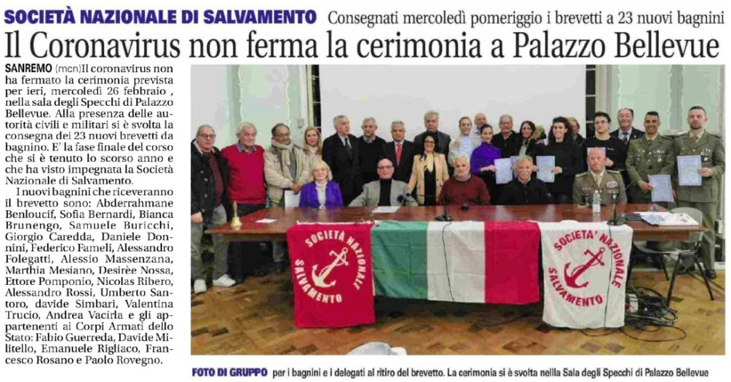 <<Pisa. Con la consegna dei brevetti si è concluso il corso per il conseguimento del patentino di bagnino della Società Nazionale di Salvamento 2019, valido per la sorveglianza in piscina, negli stabilimenti balneari come per imbarcarsi oltre che per concorsi e fogli matricolari dei militari.. I corsi per il primo soccorso e per la parte teorica si sono tenuti a Pisa nella sede alla Pubblica Assistenza in via Bargagna, per il nuoto nella piscina comunale e al vircolo Arnino per la voga sul patino.