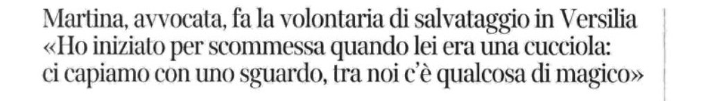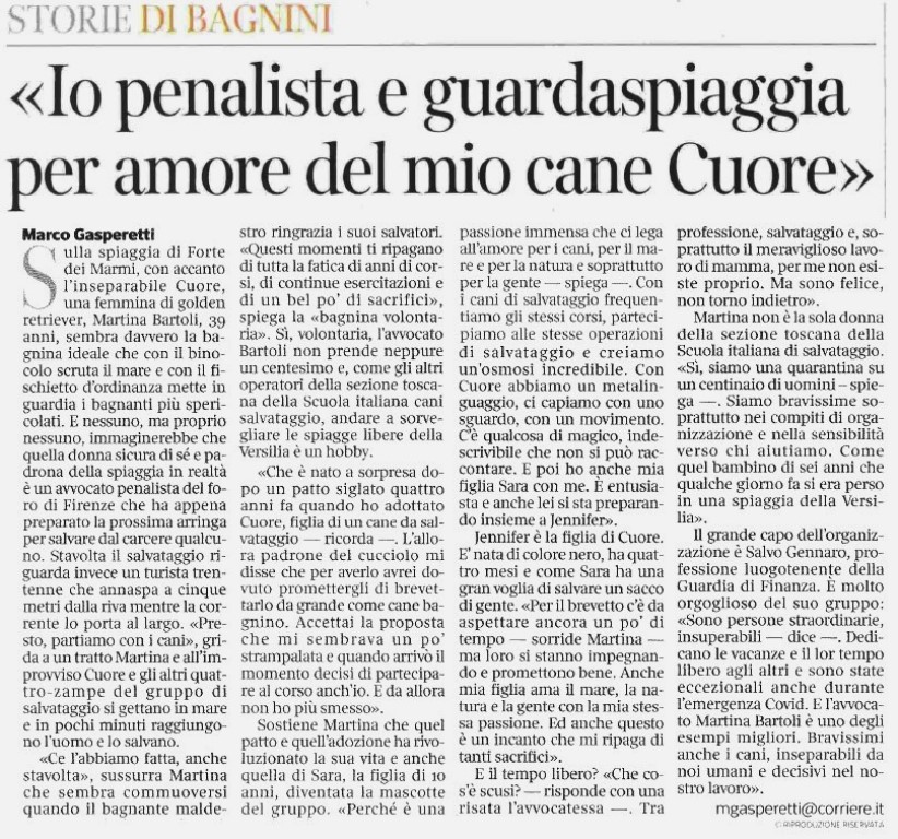 <<Sulla spiaggia di Forte dei Marmi, con accanto l’inseparabile Cuore, una femmina di golden retriever, Martina Bartoli, 39 anni, sembra davvero la bagnina ideale che con il binocolo scruta il mare e con il fischietto d’ordinanza mette in guardia i bagnanti più spericolati. E nessuno, ma proprio nessuno, immaginerebbe che quella donna sicura di sé e padrona della spiaggia in realtà è un avvocato penalista del foro di Firenze che ha appena preparato la prossima arringa per salvare dal carcere qualcuno. Stavolta il salvataggio riguarda invece un turista trentenne che annaspa a cinque metri dalla riva mentre la corrente lo porta al largo. «Presto, partiamo con i cani», grida a un tratto Martina e all’improvviso Cuore e gli altri quattro-zampe del gruppo di salvataggio si gettano in mare e in pochi minuti raggiungono l’uomo e lo salvano. «Ce l’abbiamo fatta, anche stavolta», sussurra Martina che sembra commuoversi quando il bagnante maldestro ringrazia i suoi salvatori. «Questi momenti ti ripagano di tutta la fatica di anni di corsi, di continue esercitazioni e di un bel po’ di sacrifici», spiega la «bagnina volontaria». Sì, volontaria, l’avvocato Bartoli non prende neppure un centesimo e, come gli altri operatori della sezione toscana della Scuola italiana cani salvataggio, andare a sorvegliare le spiagge libere della Versilia è un hobby. «Che è nato a sorpresa dopo un patto siglato quattro anni fa quando ho adottato Cuore, figlia di un cane da salvataggio ricorda -. L’allora padrone del cucciolo mi disse che per averlo avrei dovuto promettergli di brevettarlo da grande come cane bagnino. Accettai la proposta che mi sembrava un po’ strampalata e quando arrivò il momento decisi di partecipare al corso anch’io. E da allora non ho più smesso». Sostiene Martina che quel patto e quell’adozione ha rivoluzionato la sua vita e anche quella di Sara, la figlia di io anni, diventata la mascotte del gruppo. «Perché è una passione immensa che ci lega all’amore per i cani, per il mare e per la natura e soprattutto per la gente spiega -. Con i cani di salvataggio frequentiamo gli stessi corsi, partecipiamo alle stesse operazioni di salvataggio e creiamo un’osmosi incredibile. Con Cuore abbiamo un metalinguaggio, ci capiamo con uno sguardo, con un movimento. C’è qualcosa di magico, indescrivibile che non si può raccontare. E poi ho anche mia figlia Sara con me. È entusiasta e anche lei si sta preparando insieme a Jennifer». Jennifer è la figlia di Cuore. E’ nata di colore nero, ha quattro mesi e come Sara ha una gran voglia di salvare un sacco di gente. «Per il brevetto c’è da aspettare ancora un po’ di tempo sorride Martina ma loro si stanno impegnando e promettono bene. Anche mia figlia ama il mare, la natura e la gente con la mia stessa passione. Ed anche questo è un incanto che mi ripaga di tanti sacrifici». E il tempo libero? «Che cos’è scusi? risponde con una risata l’awocatessa -. Tra professione, salvataggio e, soprattutto il meraviglioso lavoro di mamma, per me non esiste proprio. Ma sono felice, non torno indietro». Martina non è la sola donna della sezione toscana della Scuola italiana di salvataggio. «Sì, siamo una quarantina su un centinaio di uomini – spiega -. Siamo bravissime soprattutto nei compiti di organizzazione e nella sensibilità verso chi aiutiamo. Come quel bambino di sei anni che qualche giorno fa si era perso in una spiaggia della Versilia». Il grande capo dell’organizzazione è Salvo Gennaro, professione luogotenente della Guardia di Finanza. E molto orgoglioso del suo gruppo: «Sono persone straordinarie, insuperabili dice -. Dedicano le vacanze e il lor tempo libero agli altri e sono state eccezionali anche durante l’emergenza Covid. E l’avvocato Martina Bartoli è uno degli esempi migliori. Bravissimi anche i cani, inseparabili da noi umani e decisivi nel nostro lavoro».>>