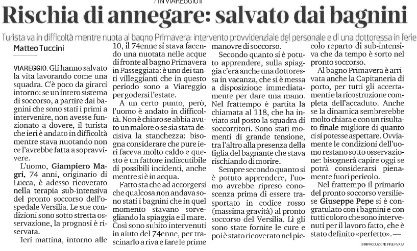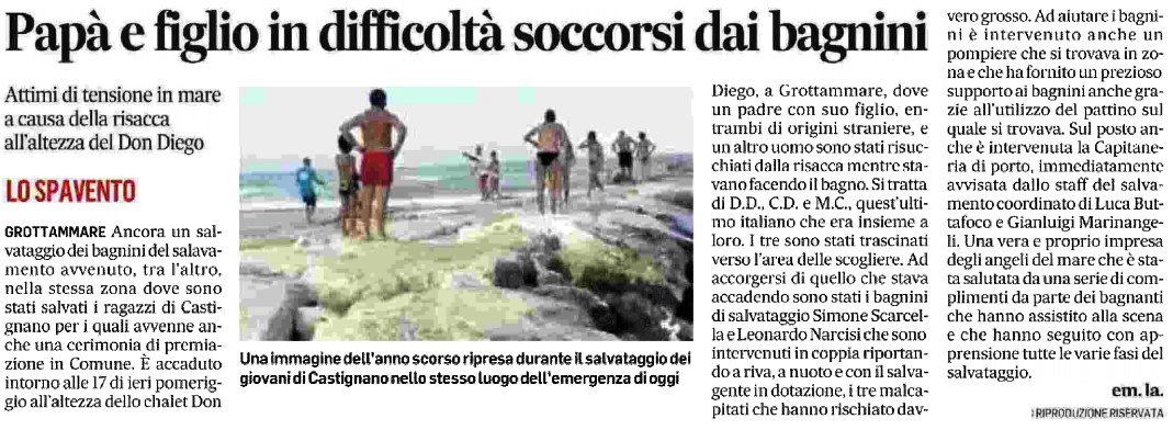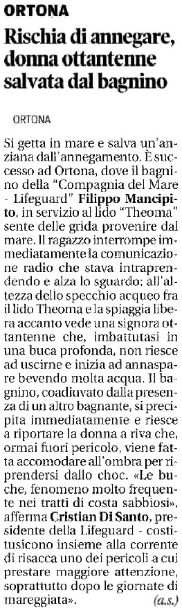 ORTONA Si getta in mare e salva un’anziana dall’annegamento. È successo ad Ortona, dove il bagnino della “Compagnia del Mare Lifeguard” Filippo Mancipito, in servizio al lido “Theoma” sente delle grida provenire dal mare. Il ragazzo interrompe immediatamente la comunicazione radio che stava intraprendendo e alza lo sguardo: all’altezza dello specchio acqueo fra il lido Theoma e la spiaggia libera accanto vede una signora ottantenne che, imbattutasi in una buca profonda, non riesce ad uscirne e inizia ad annaspare bevendo molta acqua. Il bagnino, coadiuvato dalla presenza di un altro bagnante, si precipita immediatamente e riesce a riportare la donna a riva che, ormai fuori pericolo, viene fatta accomodare all’ombra per riprendersi dallo choc. «Le buche, fenomeno molto frequente nei tratti di costa sabbiosi», afferma Cristian Di Santo, presidente della Lifeguard costitusicono insieme alla corrente di risacca uno dei pericoli a cui prestare maggiore attenzione, soprattutto dopo le giornate di mareggiata». (a.s.)