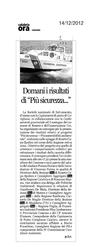 Roseto Capo Spulico – La Società Nazionale di Salvamento Sez. di Roseto Capo Spulico (CS), diretta da Vincenzo Farina, in collaborazione con Confesercenti, il patrocinio del Comune di Roseto Capo Spulico ed il sostegno del CSV Cosenza, ha organizzato il convegno “Più sicurezza, più sostenibilità ambientale”. Durante il meeting, che si è svolto sabato 14 dicembre 2012 alle ore 17 e 30, presso la Sala consiliare del Comune di Roseto Capo Spulico, sono stati presentati i risultati del progetto “Più sicurezza, più sostenibilità ambientale” realizzato sulle spiagge di Roseto C.S. durante la scorsa stagione balneare 2012.