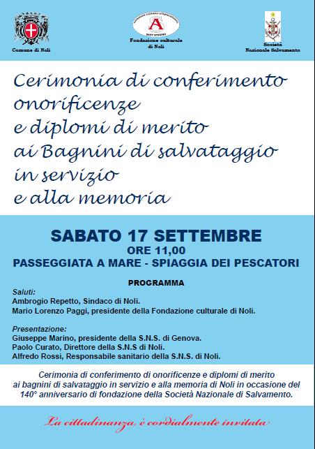 Noli – In occasione del 140° anniversario di fondazione della Società Nazionale di Salvamento, la SNS Sez. di Noli, diretta da Paolo Curato, in collaborazione con il Comune di Noli e la Fondazione Culturale di Noli, ha organizzato la “Cerimonia di conferimento onorificenze e diplomi di merito ai Bagnini di salvataggio in servizio e alla memoria”.