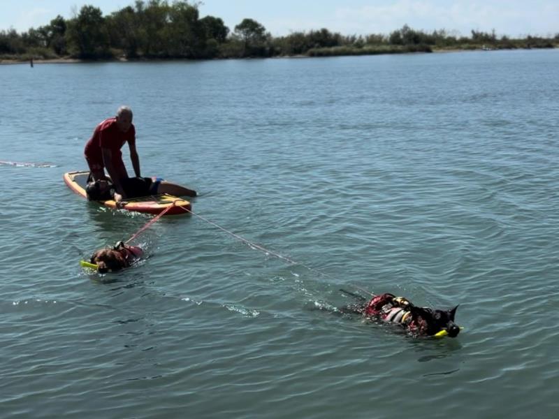 Quel giorno l’escursione di marea era di 120 cm e questo ha comportato una forte corrente entrante, vista l’esigua larghezza della foce, che ha reso un po’ complicata l’esercitazione ma ha fatto comprendere al meglio l’utilità degli “strumenti” proposti. Roberto Marconi, nostro IAMAS e addestratore cinofilo ha elencato i pregi e i limiti delle unità cinofile e poi ha dato dimostrazione, assieme alla bagnina/conduttrice Monica, e ai loro 4 cani brevettati operativi presenti: Houdini (golden retriever), Kiss (pastore olandese), Olivia (terrier russo) e Anita (alano arlecchino). A seguire il direttore di sezione, Dino Basso ha dato dimostrazione dell’uso del Sup su persona non-cosciente avvalendosi del traino di 2 unità cinofile mentre eseguiva RCP completa già a bordo del Sup. Una volta a terra si è proseguito con DAE e Ossigeno. I vertici della ULSS4 presenti, sono stati favorevolmente colpiti dalla celerità dei salvataggi proposti in un ambiente insolito e sconosciuto anche alle unità cinofile. L’esercitazione ha suscitato profonda ammirazione tra tutti i presenti riconoscendo come, organizzazione, ausili e sincronizzazione contribuiscono a rendere più celere l’attività di salvataggio“.