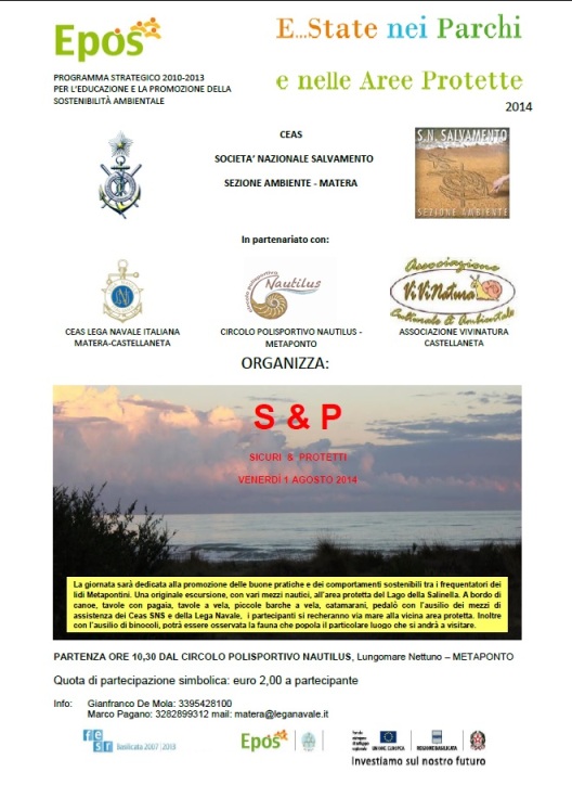 Metaponto – Venerdì 1 agosto, con partenza dal circolo polisportivo Nautilus di Metaponto, si svolgerà un’importante iniziativa inserita nel calendario di eventi organizzati dalla Regione Basilicata denominato “E…state nei Parchi e nelle Aree Protette” sostenuto da Epos, il programma regionale strategico 2010/2013 per l’educazione e la promozione della sostenibilità ambientale. La Società Nazionale di Salvamento di Matera, in partenariato con la Lega Navale Italiana Sezione di Matera e con la collaborazione dell’Associazione Vivinatura di Castellaneta ed il circolo polisportivo Nautilus di Metaponto, propongono una particolare e suggestiva escursione in una poco conosciuta ma interessantissima area protetta e riserva naturale dello Stato all’interno della pineta ionica Metapontina, presso il lago della Salinella in località Marinella di Metaponto.