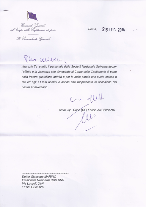 Roma – Il Comandante Generale del Corpo delle Capitanerie di Porto/Guardia Costiera, Ammiraglio Ispettore Capo (CP) Felicio Angrisano, con propria lettera del 28 luglio, ha ringraziato il Presidente Marino e tutto il personale della SNS per l’ “affetto e la vicinanza” alle CP/GC nell’attività quotidiana e per le parole estese in occasione dell’Anniversario del Corpo. Il Corpo delle Capitanerie di Porto/Guardia Costiera ha celebrato il proprio 149° anniversario lo scorso 20 luglio.