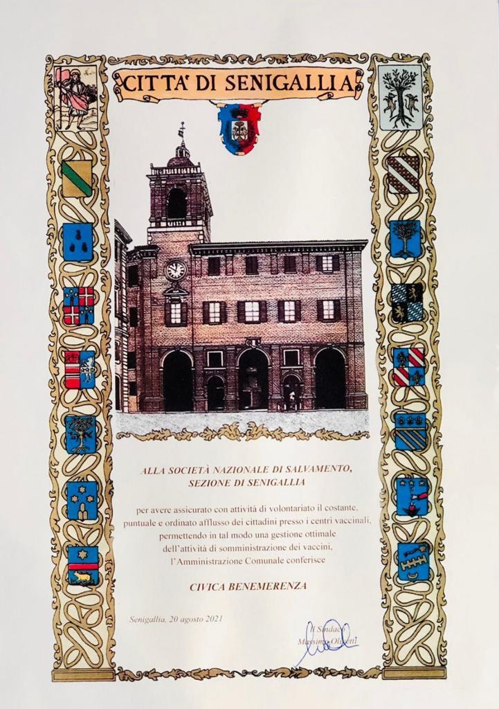 Senigallia, 14 Ottobre 2021 – L’Amministrazione Comunale di Senigallia (AN) ha consegnato alcune onorificenze alla cittadinanza tra cui la benemerenza alle Organizzazioni di Volontariato di Protezione Civile che hanno fatto parte della macchina operativa durante il periodo della pandemia, con particolare rilevanza per il grande impegno svolto nel centro vaccinale di Senigallia. In questa occasione il Comune di Senigallia ha conferito alla Società Nazionale di Salvamento Sezione di Senigallia, diretta da Severino Tricarico, la “Civica Benemerenza”.