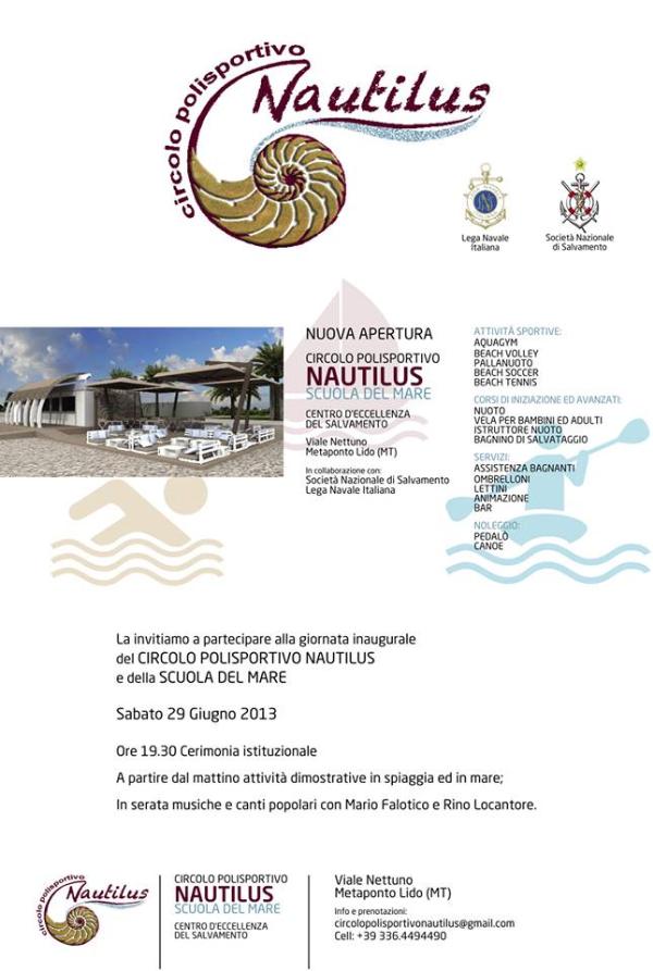 Metaponto – Sabato 29 giugno 2013 la Lega Navale Italiana e la Società Nazionale di Salvamento Sez. di Matera, diretta da Gianfranco De Mola, in collaborazione con il Circolo Polisportivo Nautilus, hanno inaugurato la “Scuola del Mare” a Metaponto, viale Nettuno, frazione di Bernalda (MT), presso il centro polisportivo Nautilus. La Scuola del Mare diventerà un centro di eccellenza per la SNS.