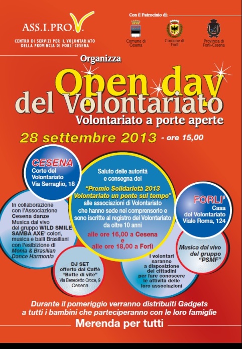 Forlì-Cesena – In occasione dell’ “Open day del Volontariato”, il 28 settembre, le case del volontariato (sedi di Ass.I.Pro.V.) di Cesena e di Forlì si sono aperte alla cittadinanza. Come al solito sono stati presenti numerosi volontari a disposizione per dare informazioni sulle attività che le associazioni svolgono quotidianamente. La manifestazione è stata pensata come momento di incontro della cittadinanza con un mondo “dedicato agli altri” vivo ed è attivo.