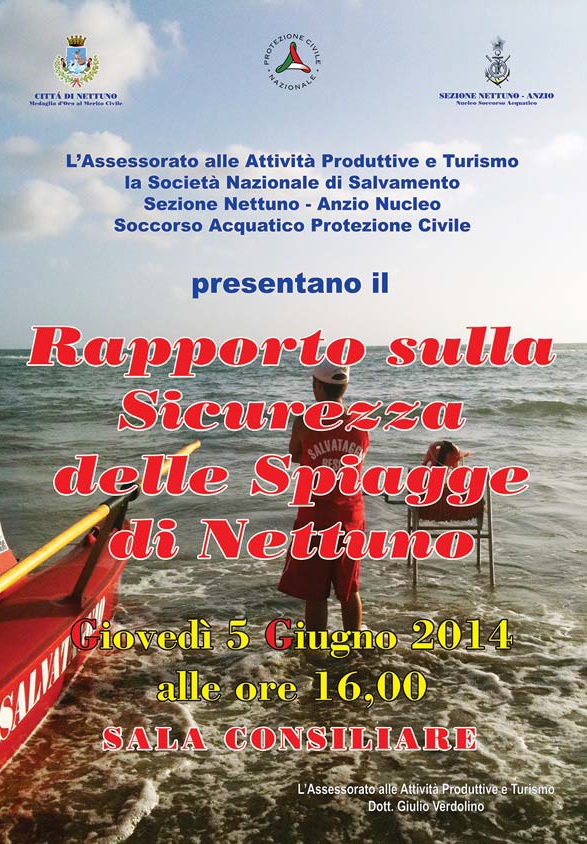 Nettuno – Giovedì 5 giugno 2014, alle ore 16, l’Assessorato alle Attività Produttive e Turismo del Comune di Nettuno, in collaborazione con la Società Nazionale di Salvamento Sez. di Nettuno – Anzio, presenta il “Rapporto sulla Sicurezza delle spiagge di Nettuno”. L’iniziativa si terrà presso la Sala Consiliare.