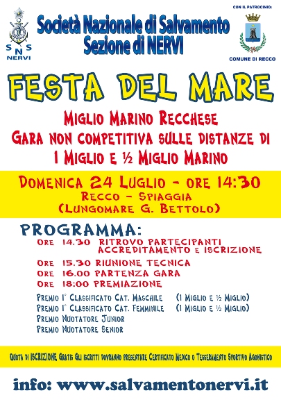 Recco – In occasione della Festa del Mare 2011 (22-23-24 Luglio), patrocinata dall’Assessorato allo Sport del Comune di Recco (GE) e con il patrocinio del Comitato provinciale del CONI, le Sezioni Territoriali di Genova-Nervi e Recco della Società Nazionale di Salvamento hanno organizzato una manifestazione sportiva di nuoto, aperta a tutti, sulle distanze di 1 miglio e ½ miglio marino.