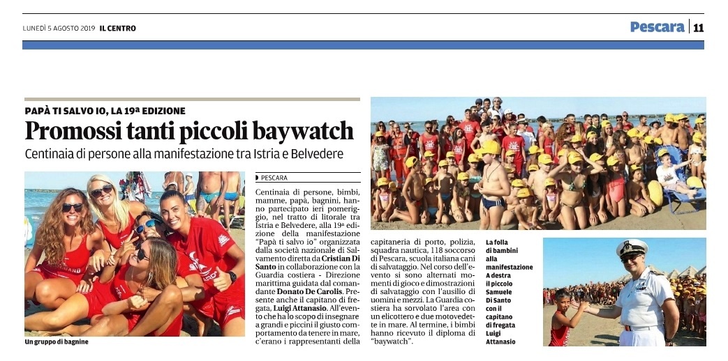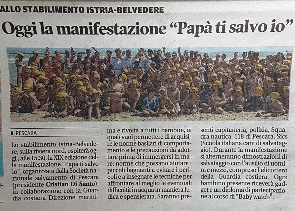 Pescara, 4 Agosto 2019 – La manifestazione “Papà ti salvo io” è giunto alla sua 19^ edizione a Pescara. Domenica 4 Agosto 2019 l’evento si è svolto presso lo stabilimento balneare Istria-Belvedere sul litorale nord pescarese.