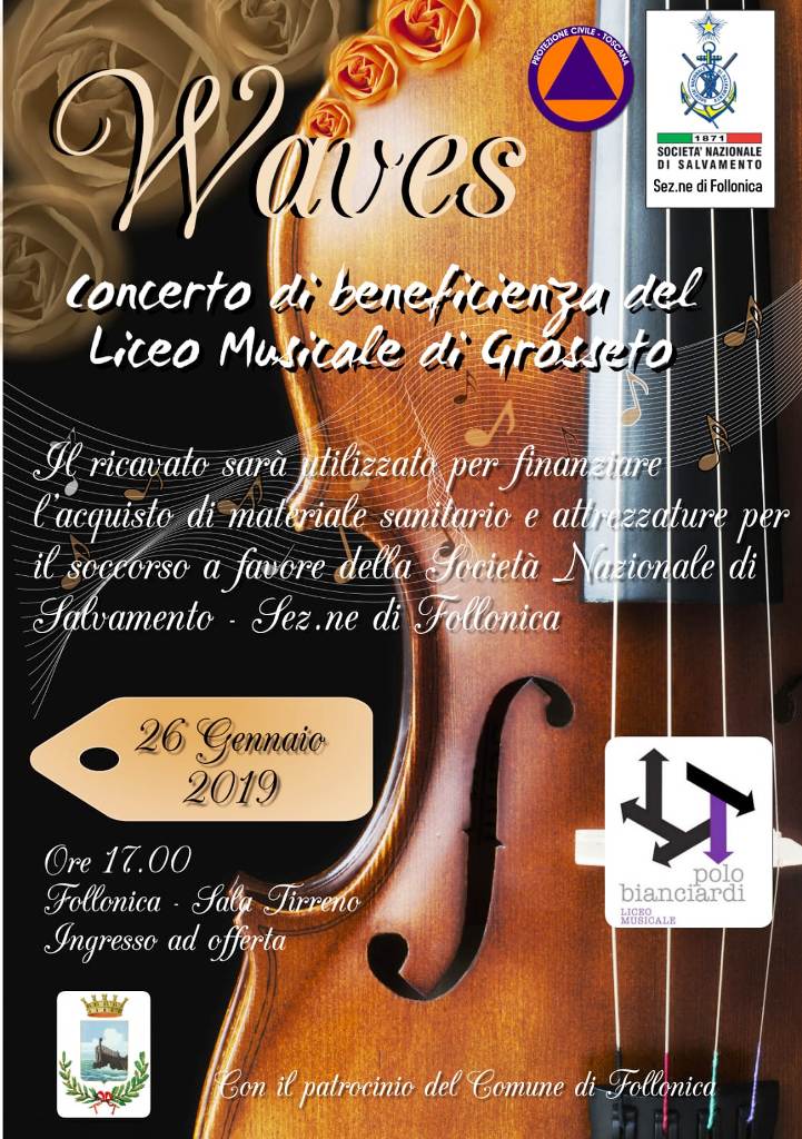 Follonica, 26 Gennaio 2019 – La Società Nazionale di Salvamento Sez. di Follonica, in collaborazione con il Liceo Musicale di Grosseto, organizza un concerto intitolato “Waves”; l’evento si svolgerà il giorno Sabato 26 Gennaio, alle ore 17, a Follonica (GR) presso la sala “Tirreno”, Via Bicocchi 53/a, con ingresso a offerta libera.